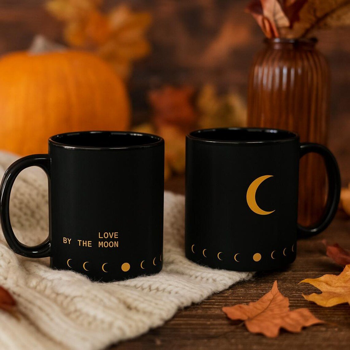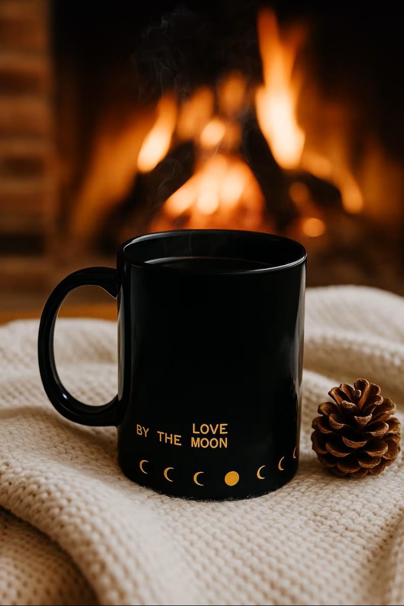 This minimalist black ceramic mug features a warm golden crescent paired with a full moon accent, simple, elegant, and quietly celestial. Designed as a gentle reminder to slow down and sip in rhythm with the moon, it is perfect for coffee, tea, or your potion of choice.